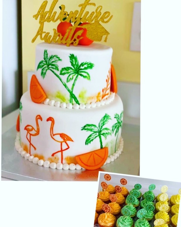 Next stop, Florida! This tropical graduation cake was perfect to celebrate Class of 2020 graduate Allison before she leaves to start her journey at Flagler College. Chocolate and vanilla cakes, covered in fondant and hand painted, with lime, lemon, and orange cupcakes, made for a perfect graduation party. Thanks for the opportunity Jen!! #LikealotCakes #cakerlife #jesslife #graduationcake2020 #classof2020 #tropicalcake #flaglercollege