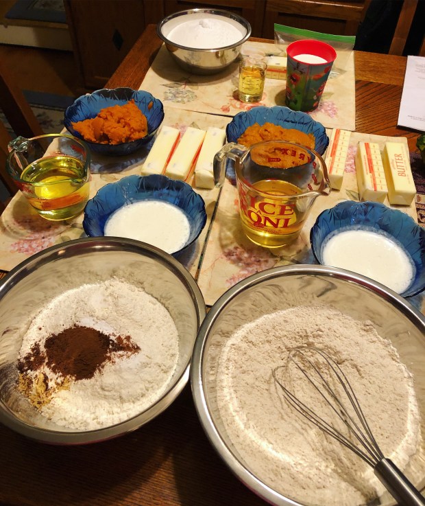 Sneak peekin’ into the kitchen… Tuesday bake off…. pumpkin and vanilla…the smell of warm fall spices… clove, ginger, nutmeg, and cinnamon, over 2 lbs of butter, 19 eggs, brown sugar, buttermilk, and all the other amazingness that goes into homemade cakes. Are you drooling yet? 😬🤤🤗 #LikealotCakes #cakerlife #jesslife #sneakpeek #pumpkincake #vanillacake #scratchbaking #lotsofbutterandeggs