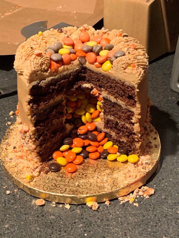 Peanut butter explosion! Chocolate cake with peanut butter buttercream (that melts in your mouth), and lots of Reese’s pieces (inside and out)! Thanks for the opportunity Courtney! #LikealotCakes #cakerlife #jesslife #reesespieces #peanutbutterchocolatecake