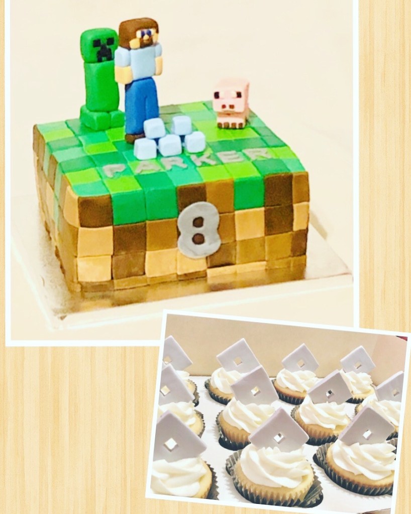 Sweet Parker. I love how specific this cool little boy is when requesting his birthday cake from his ‘cake lady’, down to the color of the toppers. Happy 8th Birthday, little buddy! We love making your cakes. Chocolate cake with chocolate buttercream, fondant Minecraft tiles, and fondant figures. Vanilla cupcakes with vanilla buttercream and fondant Roblox toppers. Thanks for the opportunity Cathlene! We love being your family baker/caker! #LikealotCakes #cakerlife #jesslife #minecraft #minecraftcake #roblox #robloxcupcakes
