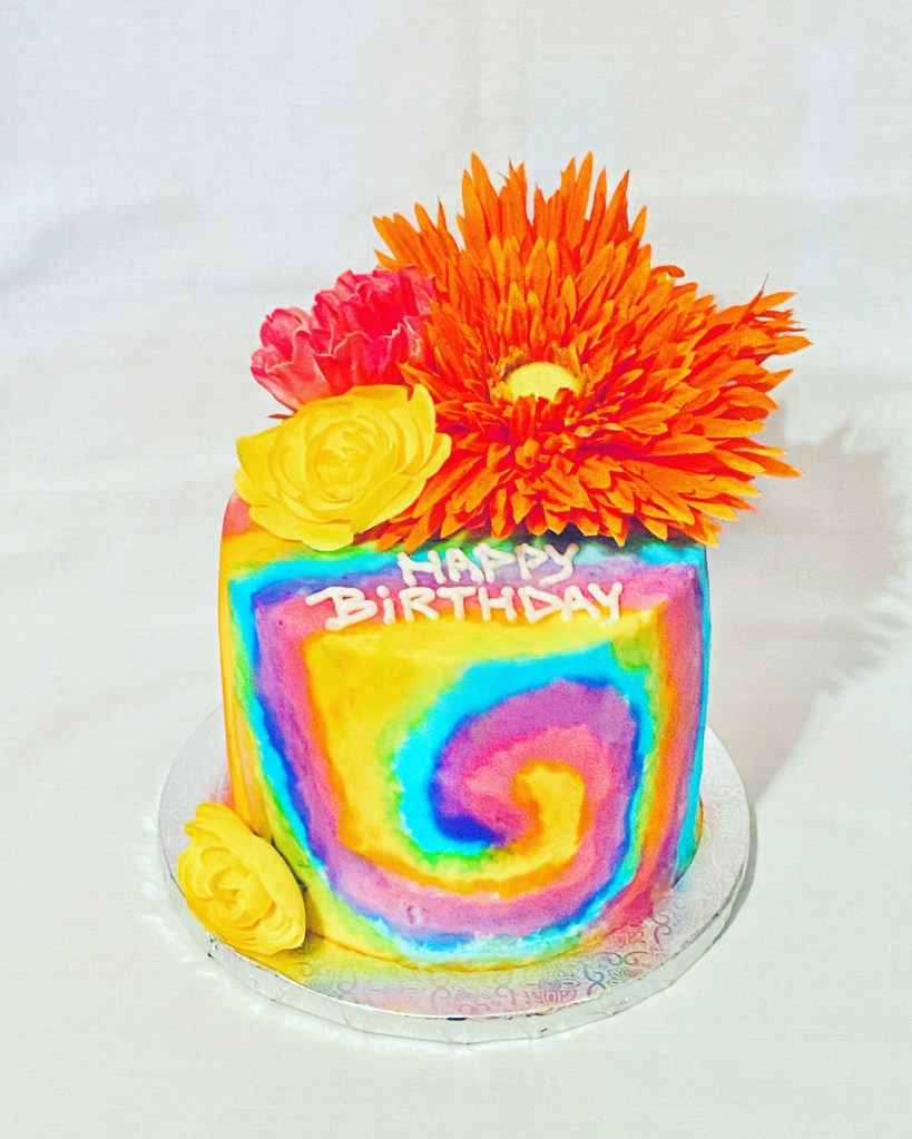 Having a little tie dye fun with cake painting! What a groovy way to celebrate a birthday! Vanilla cake with vanilla buttercream, hand painted tie dye, and bright silk flowers. Thanks for the opportunity Chelsea! I hope she loved it!! #LikealotCakes #cakerlife #jesslife #tiedye #tiedyecake #handpainted #cakeisart