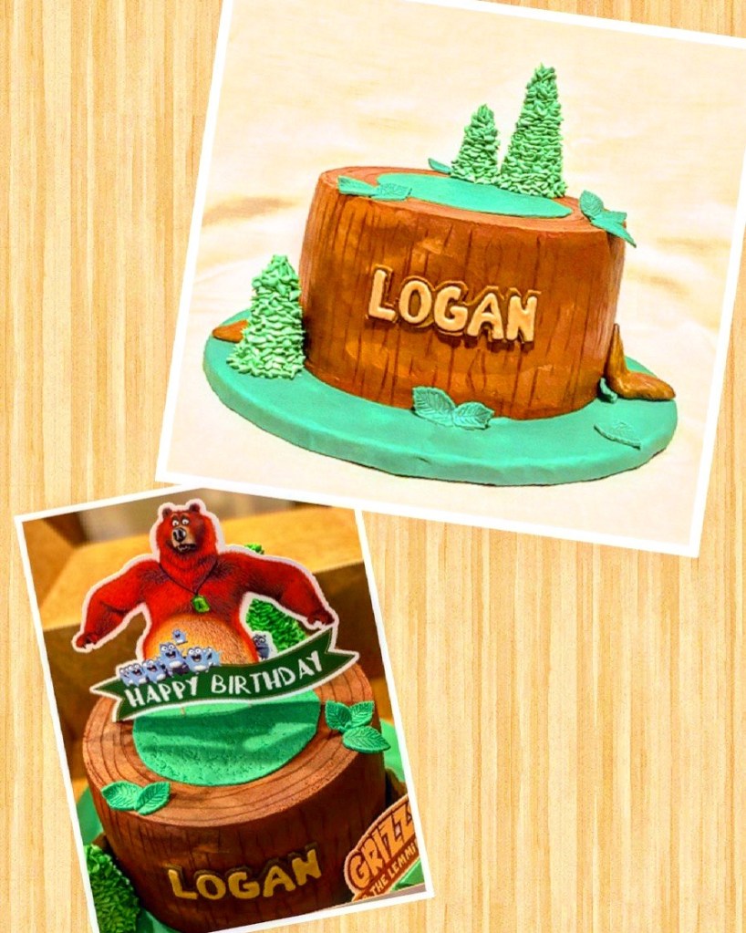 Grizzly & the Lemmings cake for Logan! He celebrated his birthday Saturday with this fun vanilla cake, raspberry reduction filling, and chocolate buttercream ‘tree trunk’ design cake with sugar cone trees and fondant accents. Thanks for the opportunity Cathy! We hope it was a hit! #LikealotCakes #cakerlife #jesslife #grizzlyandthelemmings