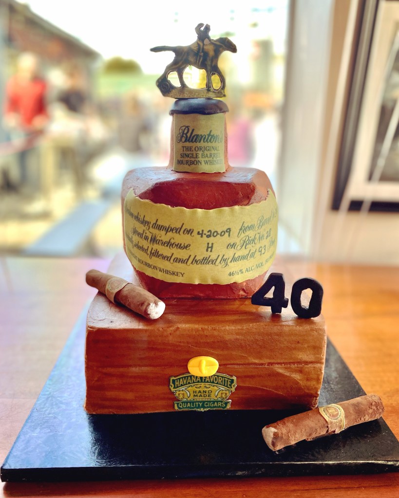 Cake 2 of the weekend was this awesome 40th birthday whiskey & cigar cake. Our second cigar box of the year! Snickerdoodle cake with cinnamon swirl buttercream filling, and chocolate Blantons’s bourbon whiskey bottle cake with vanilla buttercream. Fondant accents, edible labels, and modeling chocolate cigars. Thanks for the opportunity Mesa! We hope Josh was surprised and enjoyed it!! #LikealotCakes #cakerlife #jesslife #40thbirthday #cigarbox #blantons #cake