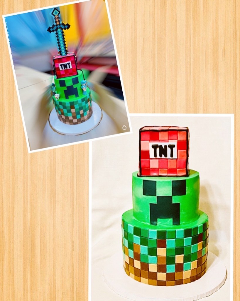 We were cranking the big cakes last weekend! Cake 3: Minecraft!! Chocolate and vanilla cakes, vanilla buttercream, with fondant tiles and accents. Yes those are all cake except for the sword and figures! Thanks for the opportunity Rachel! We love making Joseph’s cake every year! #LikealotCakes #cakerlife #jesslife #minecraft #creeper #tnt #allthetiles