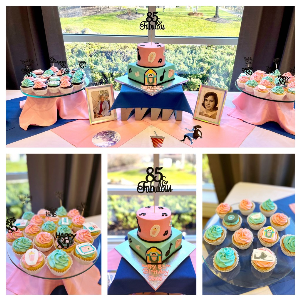 We had the privilege to help honor Jane for her 85th birthday with this amazing cake and matching cupcakes. Liz and Stephanie helped arrange this beautiful 50s sock hop themed party and display for their mom (with the help of their other siblings and family) on Saturday. Chocolate and vanilla cakes with vanilla buttercream and edible image/fondant accents, plus matching cupcakes in lemon, carrot cake, red velvet, chocolate, and vanilla. Thank you for the opportunity, Liz and Stephanie. We hope it was a wonderful party! #LikealotCakes #cakerlife #jesslife #50ssockhopparty #thisis85